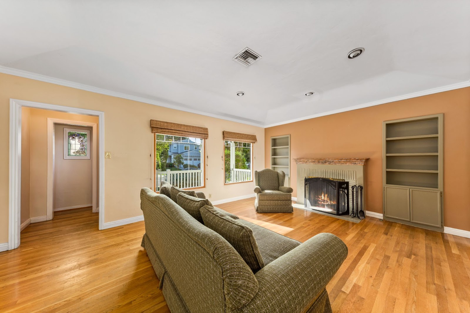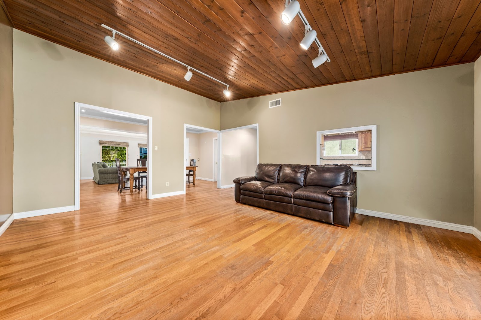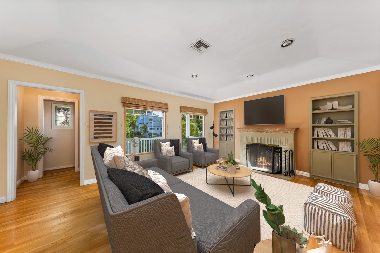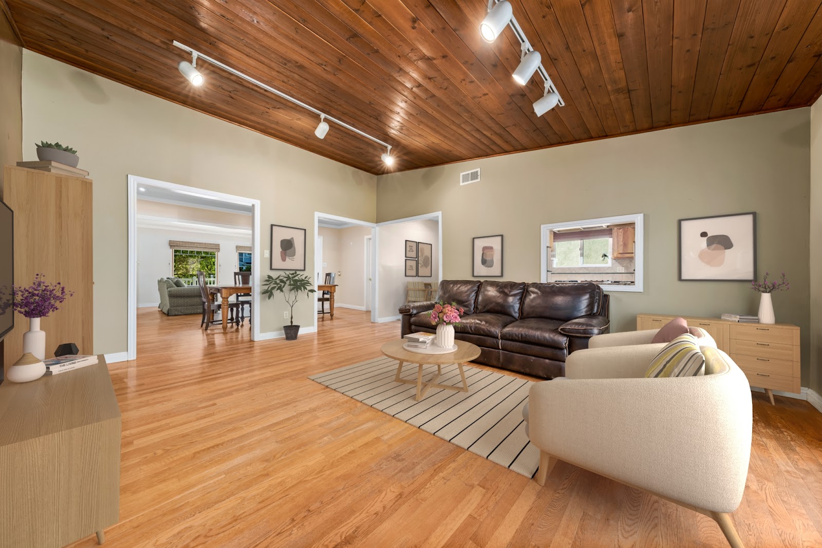 When Kathren approached us for virtual staging for real estate, she chose a Scandinavian style. According to her preferences, the tan leather couch in the living room was retained, and off-white chairs, a matching carpet, and a coffee table were added for a stylish touch.