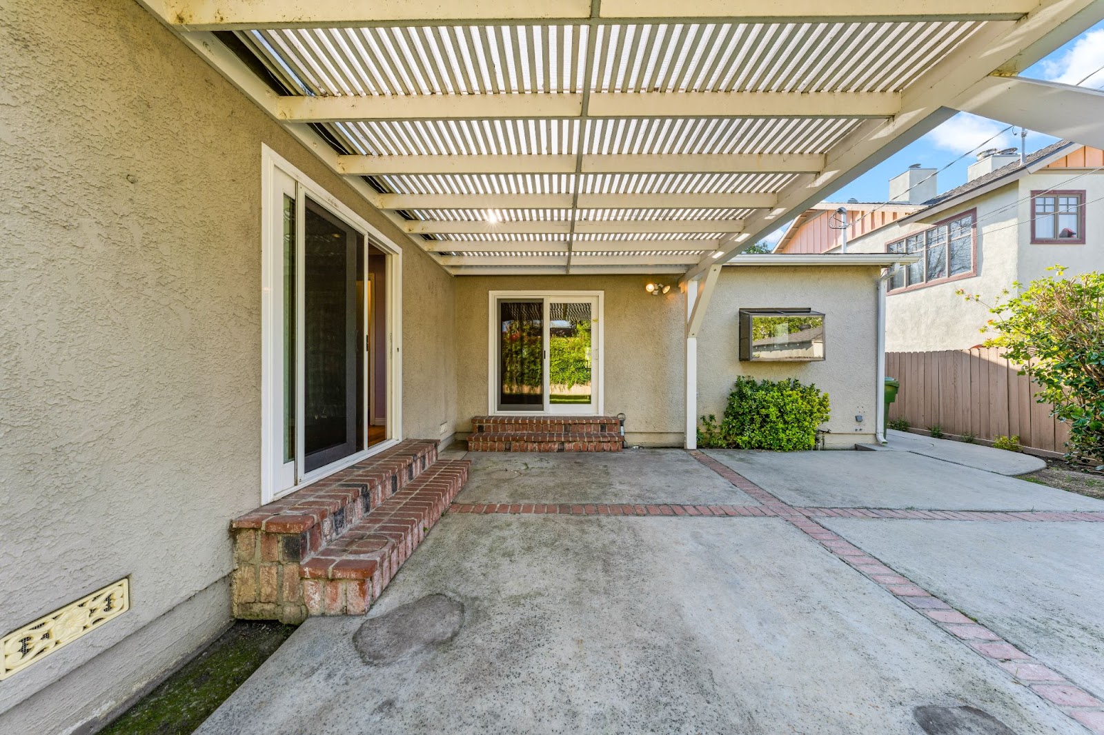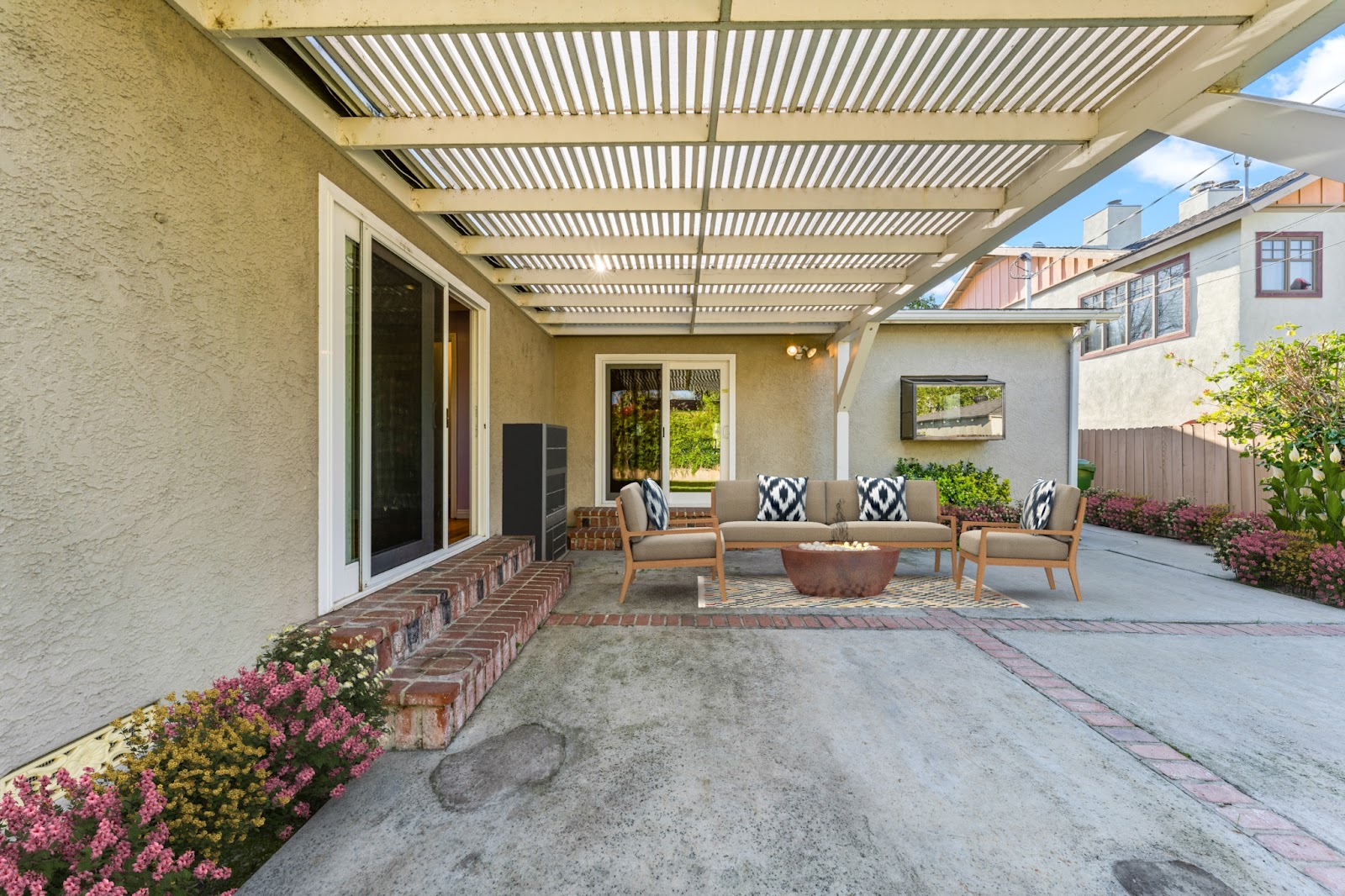 Couches, a coffee table, and plants have been added to provide life to the patio.